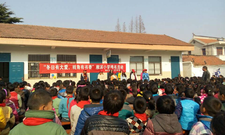 2014年12月24日南通大学情系村小社团的志愿者们来到雁滨小学,开展了“冬日存大爱·转角有书香”的志愿活动,为孩子们送去了祝福和温暖。全校学生积极参与了活动,使此次的温暖之行画上了圆满的句号。
