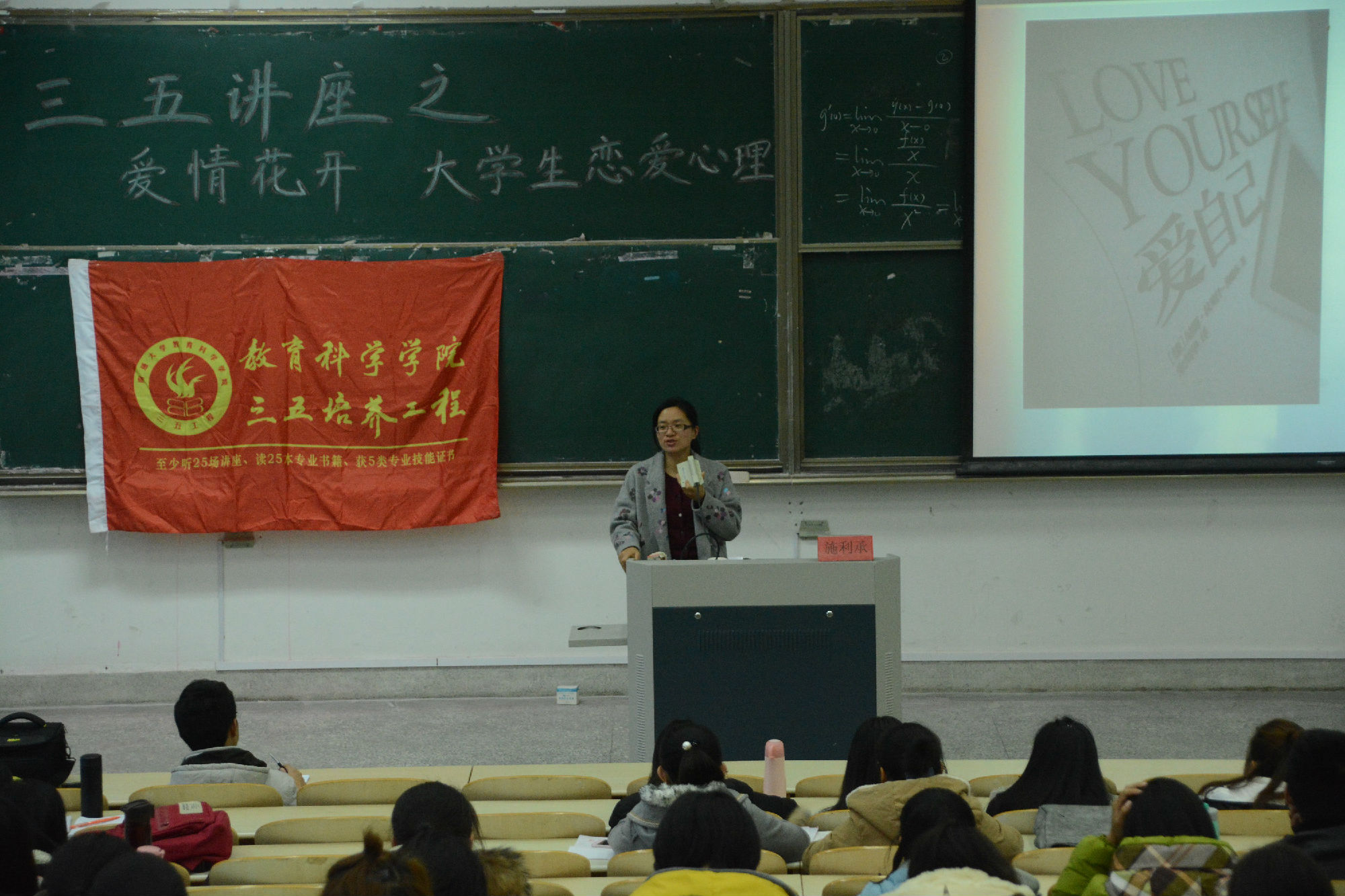 12月7日,由南通大学教育科学学主办,心理学博士施利承老师主讲的“爱情花开,恋爱心理漫谈”主题三五讲座在主校区9号楼201教室如期举行共有师生120余人参加了此次讲座。