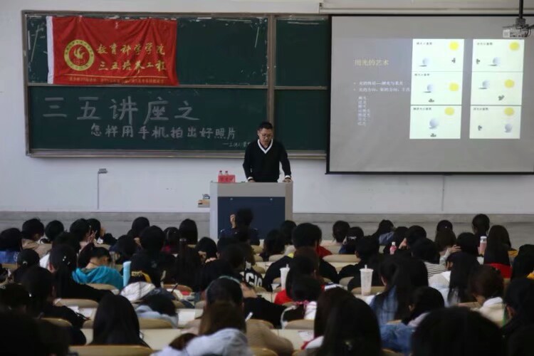 2018年3月28日下午,南通千亿qy88国际官网入口在9号楼302成功举办了以“怎样用手机拍出好照片”为主题的三五讲座。此次讲座特别邀请知名摄影师管楚迪主讲,杨晓新老师主持讲座,来自教科院的200余名本科生到场参与了此次讲座。