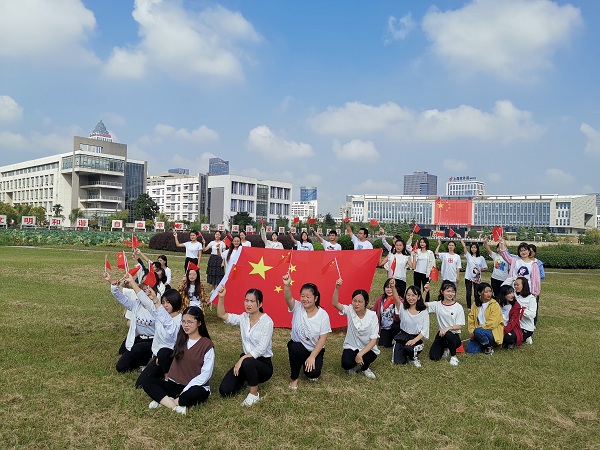 学前专业的研究生身穿白色T恤衫,手持鲜艳的小国旗,在图书馆南广场的台阶上,整齐的排列成70两个数字,以此表达对新中国成立70周年的美好祝福。
