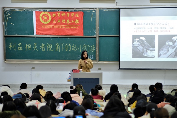 12月3日下午,南通千亿qy88国际官网入口在9号教学楼302教室成功举办了以“利益相关者视角下的幼小衔接”为主题的三五讲座,此次讲座的主讲老师是杨晨晨老师,来自教科院的260余名学生参加了本次讲座。