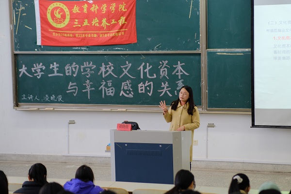 2021年3月24日13:30,南通千亿qy88国际官网入口在主校区9号教学楼302教室成功举办了以“大学生的学校文化资本与幸福感的关系”为主题的三五讲座。此次讲座由凌晓俊老师主讲,来自教科院的260余名学生参加了本次讲座。
