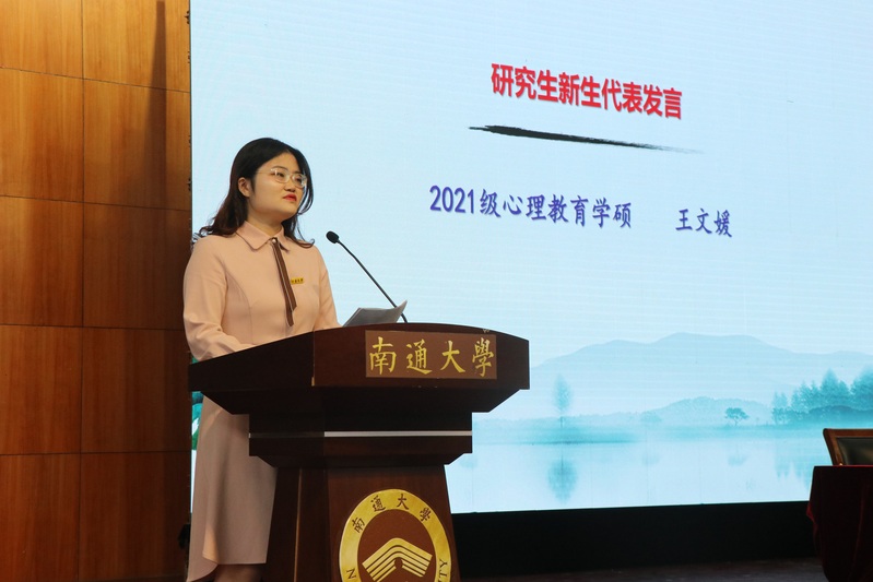 研究生新生代表、2021级心理教育学硕研究生王文媛倡导同学们要开拓眼界,积极进取,敢于走出舒适圈,培养自主性与创新性。百年传承,历久弥新,新一代的学子必将担起时代重负。