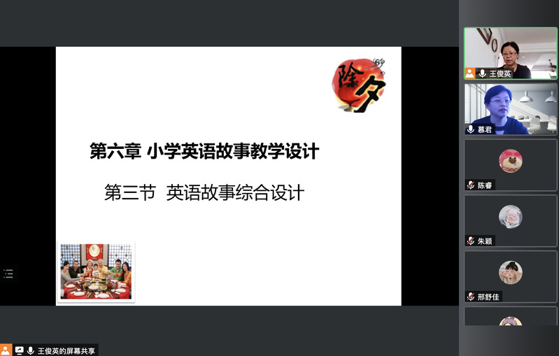 2022年5月21日下午,南通千亿qy88国际官网入口教师王俊英在腾讯会议平台以“小学英语故事综合教学”为主题,进行小学英语教学设计课程思政暨教授公开课,小教英语(定向)201班全体学生准时参课。教研室慕君主任和其他教师观摩本课程。