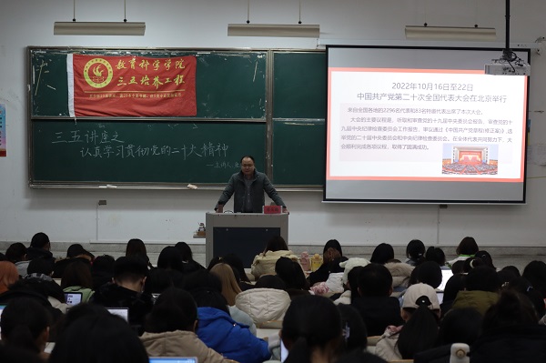 2022年11月30日,为深入学习贯彻党的二十大精神,深刻领会党二十大报告的内涵和精髓,我院邀请南通大学马克思主义学院唐庆鹏教授授作“认真学习贯彻党的二十大精神”专题讲座。讲座在9号教学楼302教室举办,教科院260余名学生参与此次讲座。