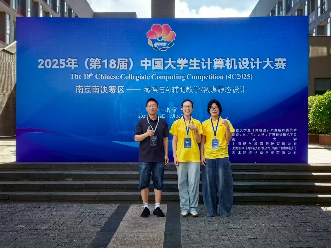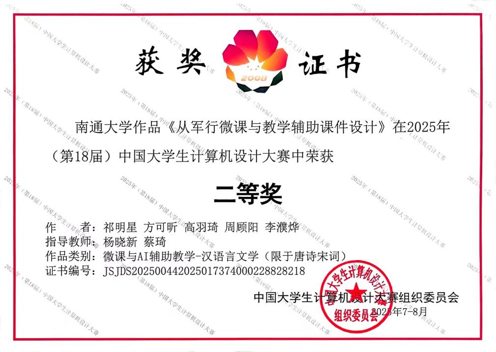 7月25日,2025年(第18届)中国大学生计算机设计大赛在南京大学落下帷幕。由杨晓新、蔡琦两位老师指导的祁明星、方可昕、高羽琦、周顾阳、李濮烨5位同学组队参赛作品《从军行微课与教学辅助课件设计项目》荣获该项大赛二等奖。