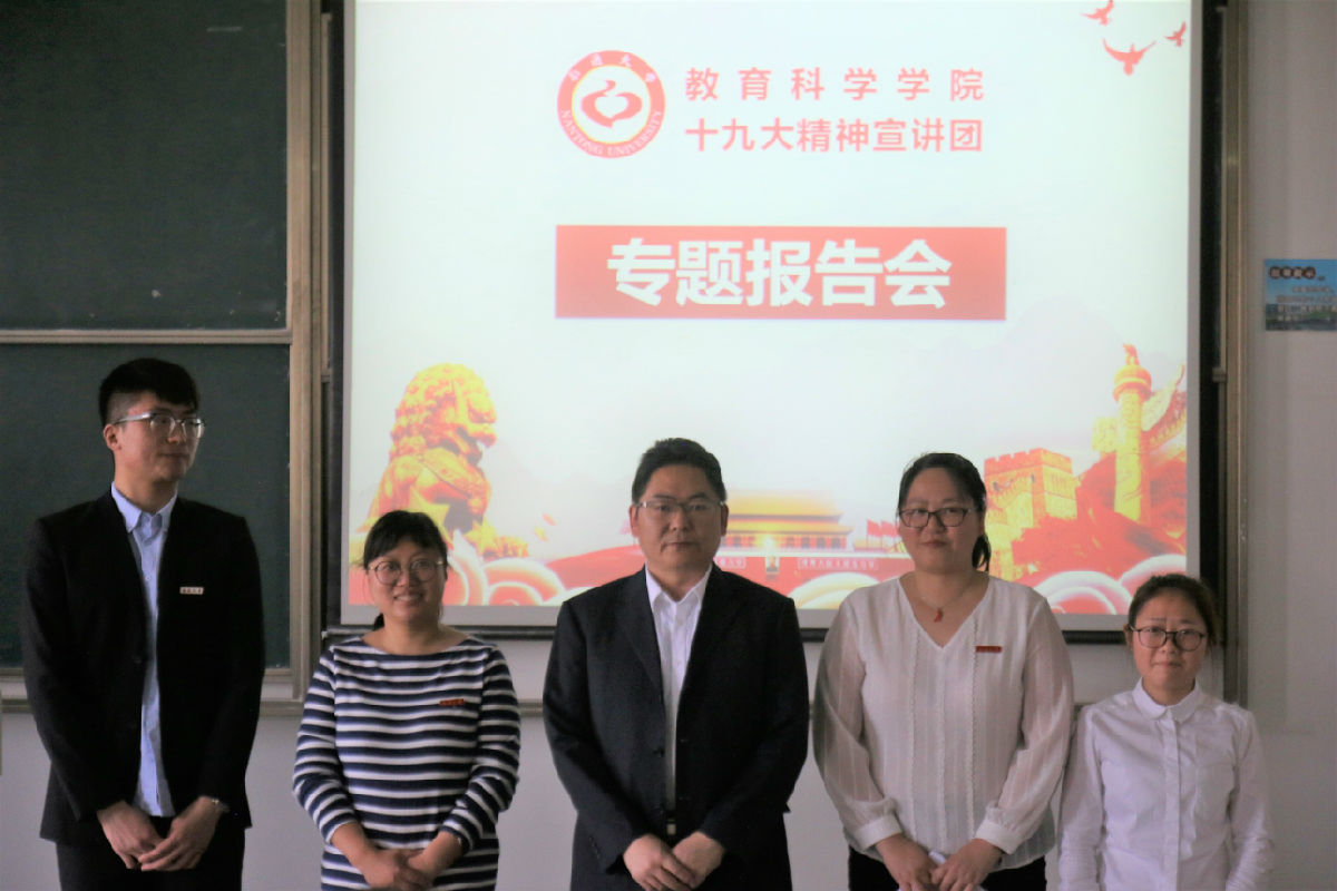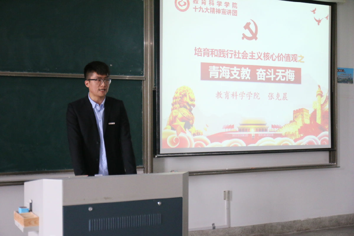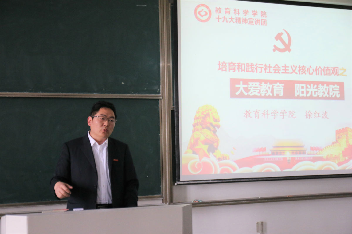 4月21日上午,由教育科学学院党总支副书记、副院长徐红波,学工办主任陈淑慧,分团委书记魏琳及优秀学生代表张克晨、陈幸佳组成的十九大精神宣讲团为第二十二期入党积极分子培训班学员作“十九大精神”专题报告会。