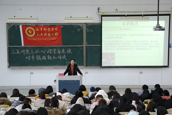 12月12日13:30,南通千亿qy88国际官网入口于9号教学楼202教室成功举办了以“从心理学角度谈对幸福指数的解读”为主题的三五讲座。本次讲座由校就业中心的邱佩钰老师主讲,教科院280余名学生到场参加。