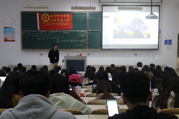 为拓宽学生的知识和学术视野,提高学生科学文化与人文素养,规划更有意义的大学生活,教育科学学院于11月2日在九号教学楼202教室举办以“大学该如何过?——基于心理学视角的诠释”为主题的“三五”讲座。讲座由陈乐乐老师担任主讲老师,教育科学学院的260余名同学参加了讲座。